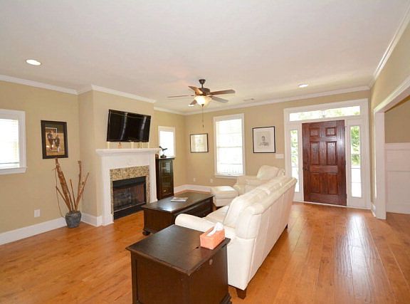 Charleston style home with a rocking chair front porch and large side porch, 4 spacious bedrooms with the owner's suite on the main level, owner's bath has double vanity, separate tub and tiled shower, 3 bedrooms up with an additional loft area and 2 full baths, kitchen boasts granite countertops, stainless steel appliances with a gas cooktop, butler's pantry and a large walk in pantry with wood shelving, Formal dining room and hardwood floors throughout the downstairs living areas, bathrooms and laundry room have tile floors and carpet upstairs, wonderful sunroom perfect for morning coffee or reading, 2 car garage with a breezeway to house. Greenspace area behind the house for privacy. Small Park located across the street. Wonderful home that is ready for a quick move in. *square footage to be verified during due diligence*