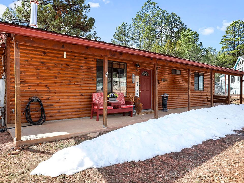 Rustic Elegance Meets Mountain Comfort: Discover the epitome of mountain living in this enchanting log-sided home. Nestled in a peaceful yet accessible location, this 2-bd/2ba haven boasts vaulted knotty pine ceilings and a picturesque fireplace with stone facing, creating a cozy retreat from the world. Step outside to your fenced rear yard, where a gazebo, garden area and dog run await, providing the perfect backdrop for outdoor gatherings or quiet moments of reflection. Relax on the covered front or rear porch and soak in the serene mountain views. Inside, the inviting interior showcases Knotty Alder cabinets and a spacious breakfast bar, offering both functionality and charm. Whether you're seeking a weekend escape or permanent family retreat, this home offers the perfect blend of rustic elegance and mountain comfort. When the home was constructed dual plumbing was installed so that you could go either propane or electric. A portion of the garage was converted into a family room with approximately 200 sf which is not reflected in the livable sf on the listing. Home also has W/D hookup in the garage should potential buyer would like to move the laundry to the garage.