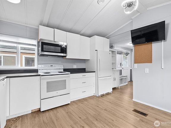 Welcome to your charming retreat in the heart of Loganberry Park, an all-ages community! Step inside to discover a bright, open layout where the living area flows seamlessly into the kitchen featuring sleek appliances and ample cabinetry. Primary bedroom is a true haven, features dual access, a spacious full bathroom with a contemporary vanity, and generous closet space. The second bedroom, thoughtfully positioned for privacy, is ideal for guests or a home office. Vaulted ceiling in the living room for an airy feel, and a full-size laundry area for added convenience. Outside, unwind in the low-maintenance yard and complete with storage shed. Space rent $710/month covers water, sewer, and garbage, making life here as easy as it is enjoyable.