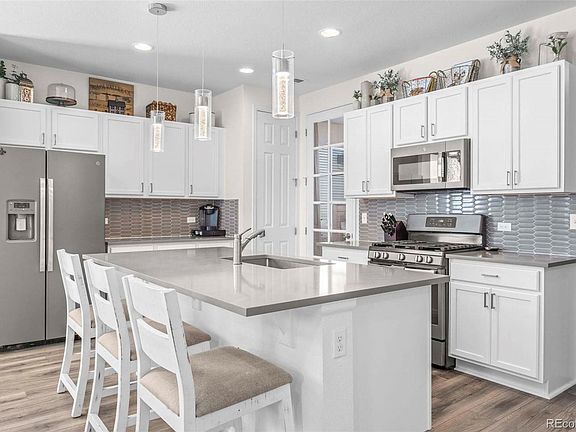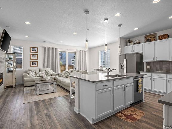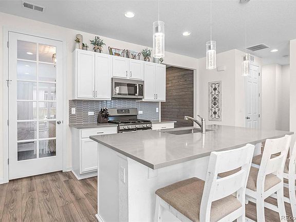 Better than new Ranch home near parks, trails and more! This impeccable home truly reflects the pride of ownership and is turnkey ready with luxury flooring extending throughout the main level, a bright and open family room with fireplace, tile wall and wood mantel. The kitchen is a chef’s delight with a large center island with room for seating, custom pendant lighting, custom backsplash and Stainless Steel appliances, all included. This great layout is main floor living at its best with everything on one level and no stairs! The spacious primary suite boasts a walk-in closet and private bathroom with dual sinks, quartz counters and walk-in shower. The main living continues with a secondary bedroom, full bathroom and office with French doors that can also be used as an additional non-conforming bedroom. Step outside to your fully fenced private backyard with a covered patio offering the perfect setup for outdoor entertainment. Great location in the neighborhood, close to Southlawn Park, Second Creek Open Space and just a short drive to Buffalo Run Golf Course. Near shopping, dining and close to major routes for convenient commuting to Denver, DIA and Boulder. Don’t miss out on this well appointed home that is the perfect setup for Ranch living!