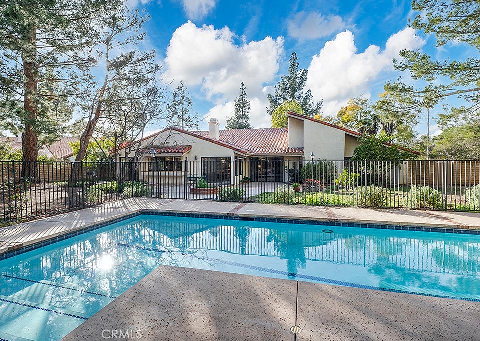 This Spanish contemporary home boasts nearly 3500 square feet of living space and sits on an impressive 20,000 square foot lot, providing ample space and privacy. Prestigious private setting features 5 bedrooms and 4 bathrooms, 2 separate bedroom wings, flexible floor plan for in-laws, office or grown children. The 5th bedroom is being used as an office with 2 work stations, a computer station, built ins galore. Wow, what a dream office! As you step inside, you will be greeted by soaring ceilings and an open floor plan that offers a seamless flow between living spaces. The abundance of natural light that streams in from the windows and skylights throughout the home creates a warm and inviting atmosphere. Chefs kitchen with center island, volume ceilings. custom cabinets, stainless steel appliances, professional hood and peaceful view of sparkling safety fenced pool and spa.