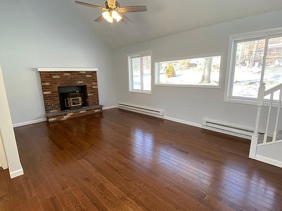 Completely Renovated. All new flooring throughout. New modern kitchen with SS appliances, washer & dryer. Dining area with sliders, opens up to the wrap around deck. Living room has fireplace and lots of natural light. 2 more bedrooms and a full bath upstairs. Primary has lovely balcony overlooking the yard. Gated community, landlord covers HOA fees and trash. Pets will be considered on a case by case basis with $500 non refundable security deposit. First months rent, 2 month's security and broker's fee paid by tenant.