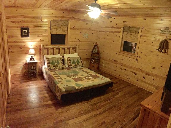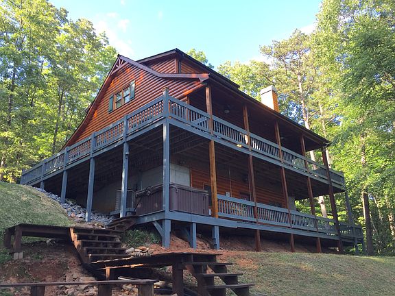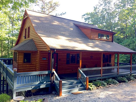 Be captivated by the mountain views from this well built D-log cabin. Abundant custom features include Mountain Laurel shelving and railings, all T&G interior accented w/pickled pine. Loads of closets and storage space, unique lighting & fixtures. Towering wood burning fireplace in living room w/built-in wood box. Wrap around decks lead to screened rocking chair back porch. Huge master has walk-in closet and adjoining bath w/garden tub. Spacious full finished basement w/multi-use rooms, laundry room & full bath. All Paved to within a few hundred feet of house w/easy circle driveway. Near BR Swim & Tennis Club. 10 minutes to historical downtown Blue Ridge.