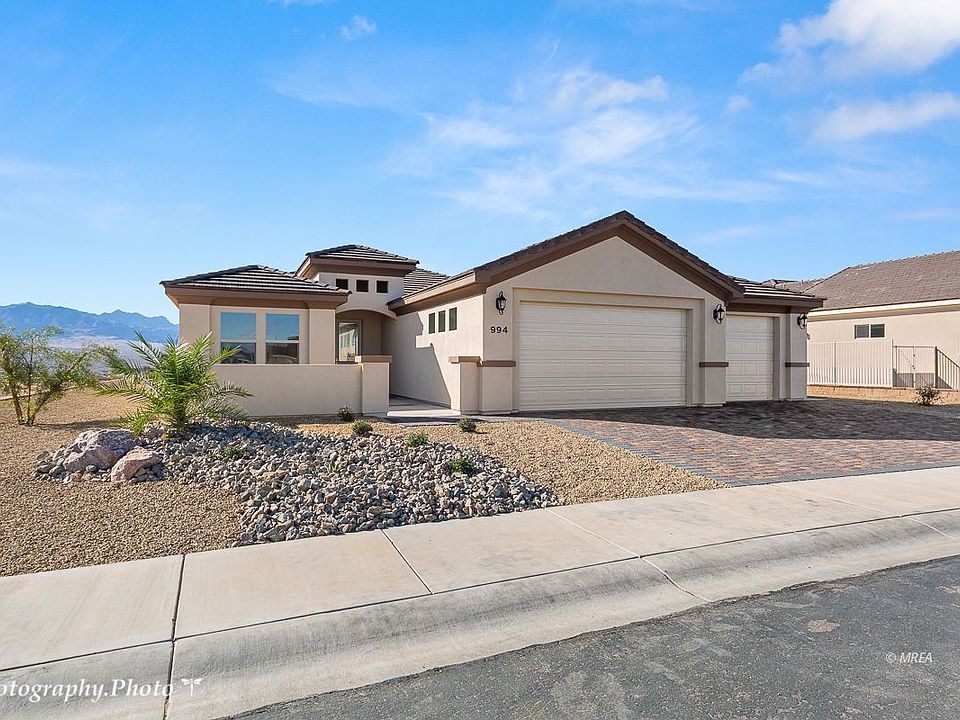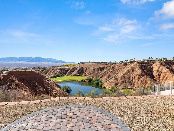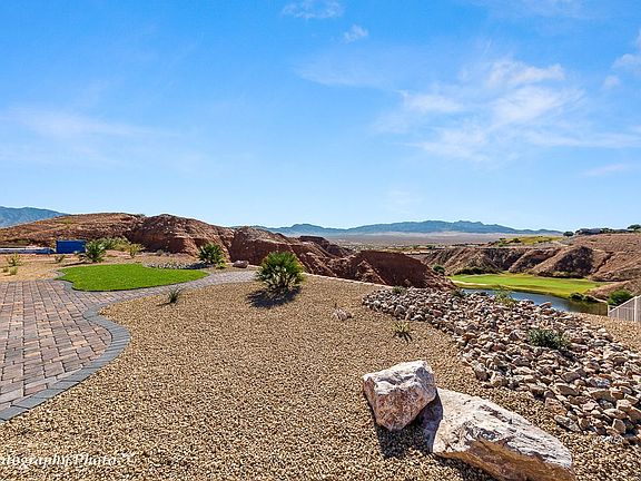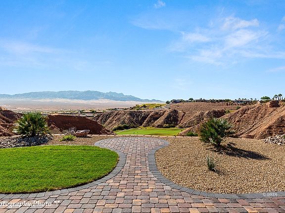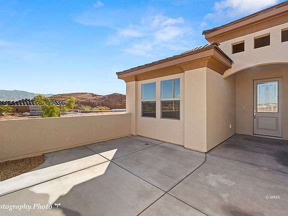 This brand new home is located in Shadow Crest, an active adult, gated community. This elevated .25/acre home site is truly ONE OF A KIND. Enjoy absolutely exquisite views of the southern mountains, Falcon Ridge Golf Course and lake, City of Mesquite and distant desert bluffs. The southern orientation is ideal for year round use of the outdoors. The yard is beautifully landscaped and the extended Paver patio provides the perfect spot to take in the view. The front of the home has a spacious courtyard and Paver driveway. The floor plan has an open concept and vaulted ceilings. The kitchen has a contemporary flare with attractive cabinets, Quartz counter tops, stainless steel appliances, a costly GE Profile refrigerator and a $1,300 wine cooler. The great room has a fireplace, surround sound and an impressive ceiling fan. The master bathroom has a tile surround walk-in shower. The den/office is off the entry. Large tile runs through the traffic areas and the laundry room is lined with cabinets, work desk and storage closet. The 931/SF garage has an epoxy coated floor, water softener and has a separate air conditioner. The window coverings will be installed November 5th. Owner/Agent.