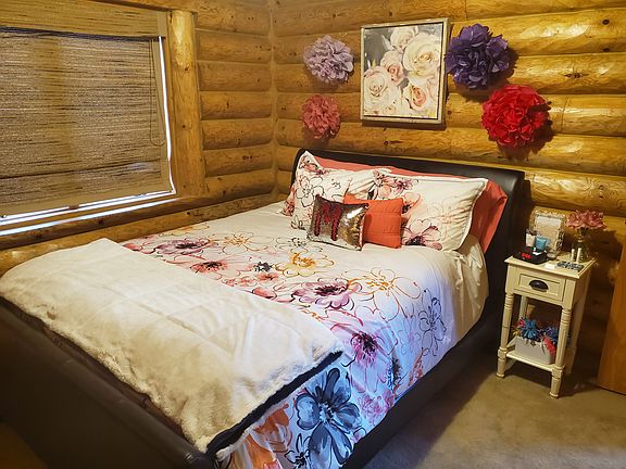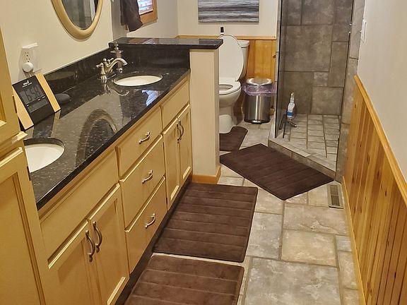 Gorgeous log cabin with guest house, sleeps 12-16. Completely updated main living area with new wood floors, carpets, patio doors, kitchen cabinets, high end appliances, bathrooms and tile floors. Granite countertops in kitchen and all bathrooms. Commercial grade gas stove and oven. Large outdoor patio with beautiful lake views and fire pit. Easy lake access with a tram or new composite stairs in 2016. Lake frontage is perfect for swimming with gradual slope and sandy bottom. Lakeshore patio and shed for easy storage. New furnace and AC in 2016. Lake living at it's finest!
