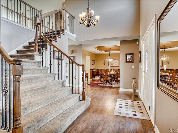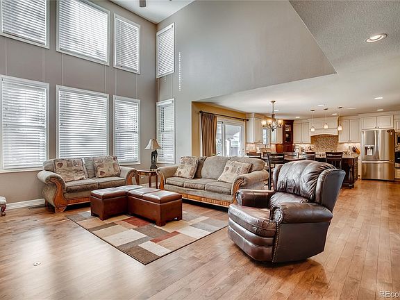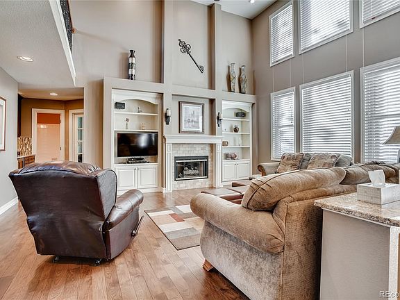 This is a very special home nestled in Highlands Ranch. The original owners truly hate to leave this wonderful home! You will fall in love the moment you walk into the beautiful grand foyer. The gourmet chef's kitchen includes three ovens, a 5 burner cooktop, custom vent, under cabinet lighting, custom built-in storage in drawers, oversized island with a prep sink and a closet pantry. The stunning kitchen opens to family room with gas fireplace and dramatic vaulted ceilings. The sun pours in from the abundant windows. Main floor study with built-in desk. Upstairs you will find 5 bedrooms and 3 full baths and very unique recreation room with wet bar. Master bedroom has bay window with a sitting bench and storage and a large walk-in closet with a custom organizer. The 5-piece master bathroom complete with rain shower and soaking tub! Finished basement with bath, bedroom, workout room and wine room! It has an OVERSIZED, IMPECCABLE, FOUR CAR GARAGE! You will love the cul-de-sac location with access to many walking trails and the large landscaped backyard with open space views of the mountains and the Highlands Ranch Mansions working farm!