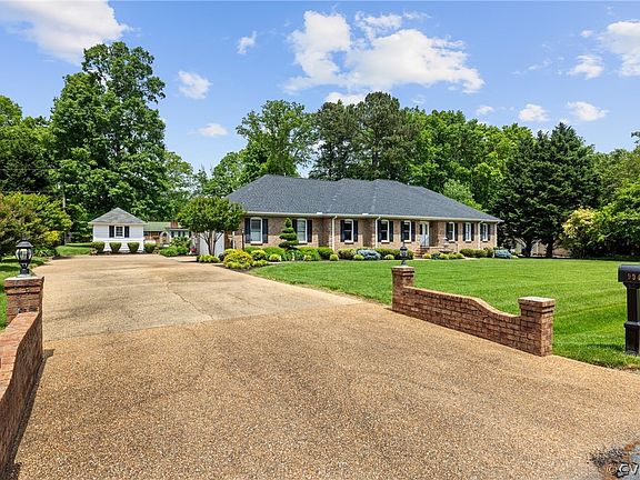 Welcome to Southern Living at its finest in this quality-built brick rancher nestled off the Hull Street Corridor in Mayfair Estates! This immaculate home offers the epitome of first-floor living with 4 bedrooms and 2.5 baths. Step inside to discover a renovated kitchen featuring granite countertops, tile backsplash, tile floors complemented by stainless steel appliances including a 5-burner gas cooktop, built-in microwave, refrigerator & double stainless sink. The bar seating & birch wood cabinets add a touch of southern charm. Throughout the home, you'll find solid wood doors, hardwood floors, & tile flooring, adding warmth and character to every room. The oversized Primary Bedroom boasts a renovated primary shower w/ floor-to-ceiling tile, a bench, double vanity, jetted tub, heat lamps, & skylights, creating a luxurious retreat. Entertain w/ ease in the two spacious living rooms, one featuring a floor-to-ceiling brick gas fireplace w/ a hearth, perfect for cozy gatherings on cool evenings. Experience the sunroom of your dreams! This sun-drenched space features a vaulted beam ceiling, skylights, & French doors that seamlessly connect to the family room. Outside, the manicured lawns and gardens showcase a variety of flora including palm trees, hydrangeas, peonies, tulips, irises, and lilies, all framed by mature plantings & trees. Enjoy the serene ambiance from the low-maintenance Trex and PVC Deck overlooking the gardens & private saltwater pool. An additional outdoor shaded sitting area, complete w/ a built-in Sonos system, is ideal for entertaining guests. The exterior lighting includes lights along the driveway, fence wall around the pool, flood lights, & a post light by the sidewalk, enhancing the beauty of the property at night. Practical features include two detached sheds w/ electricity, a double-wide aggregate driveway & sidewalks, & an oversized 2-car garage with a storage room. Storage is plentiful w/ the potential for finishing off the second floor & utilizing the walk-in attic storage space.