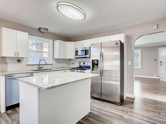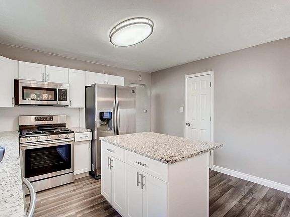 Beautifully remodeled New England Heights home within walking distance to Stanley Marketplace! The floor plan can't be beat with 2 bedrooms, 1 bath upstairs and 2 bedrooms, 1 bath in the basement. New interior paint, New exterior paint, Certificated roof,New doors and hardware, New windows, New carpet in basement,Covered patio,Newer furnace and water heater, new bathrooms, Samsung stainless steel appliances, granite countertops & island and shaker style cabinets. Brand new detached oversized 1 car garage. This trendy neighborhood is close to Northfield shopping center, schools, Anschutz Campus, University Hospital, and the state of the art Moorhead Rec Center.