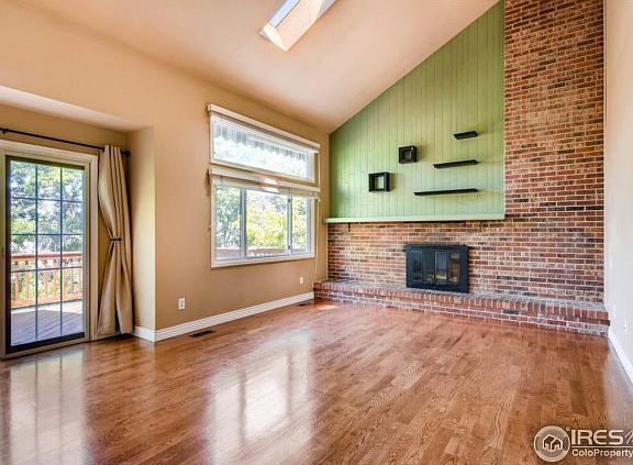 This house will feel like your home the minute you walk into the family room. Bright and beautiful with a wall of windows, vaulted ceiling with skylights, hardwood floors, gas brick fireplace, and designer selected colors. Continue on through a Pella sliding door to the oversize 20x10 foot deck that offers privacy for morning coffee and evening entertaining. The mature trees provide shade and seclusion in the summer and mountain views to the west in the winter. Quick move-in now available. Pride of ownership shines in this neighborhood. Super quiet w/no traffic. Least priced home on the street. New carpet upstairs. New exterior paint this spring. Newer roof only a couple of years old. Washer & dryer, all kitchen appliances & storage shed included. Trampoline can be included just by asking! Super convenient to all shopping.