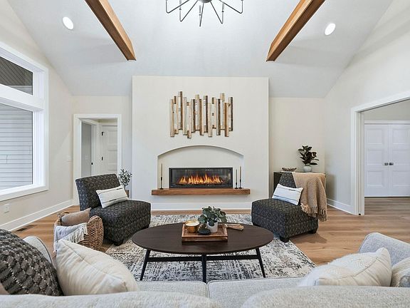 Welcome to this sleek & modern Quality Crafted Home located in Orchard Hills on the Northeast side of town. This floor plan features 3 bedrooms, 2 full bathrooms plus a den, office or playroom. The spacious kitchen features custom cabinets, quartz countertops, tiled backsplash, walk-in pantry, and views into the great room. The great room is perfect for entertaining with a cathedral ceiling, wood beams, and 55 inch modern fireplace with arched detail. Enjoy the privacy of having two bedrooms and a bathroom on one end of the home, with the master suite on the other side of the home. This spacious master suite includes a tiled walk-in shower, quartz countertops, and a large walk-in closet with custom shelving. Outside, soak in the pond views underneath a covered porch. The details in this home are unforgettable.