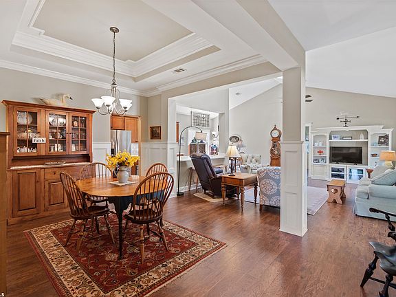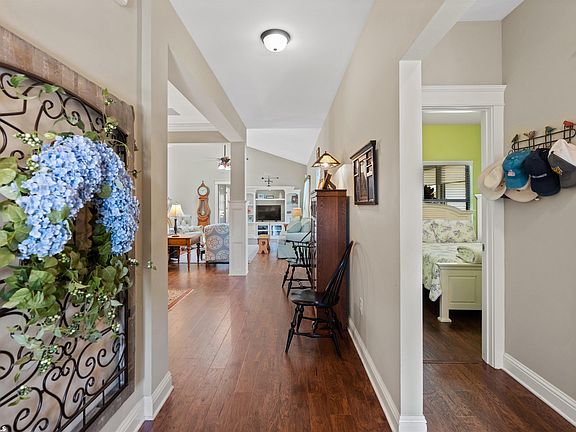 This adorable 3-bedroom, 2-bathroom custom brick home in Oldfield Phase I is the perfect blend of comfort and convenience. The open-concept living area with vaulted ceiling and skylights boasts plenty of natural light, creating a warm and inviting atmosphere. The adjacent dining area with beautiful crown moulding and wainscoting is ideal for family gatherings and dinner parties. The updated galley kitchen overlooks the living room and features new quartz countertops, stainless steel appliances, tile backsplash and ample cabinet space. Enjoy your morning coffee or unwind after a long day in the enclosed sunroom with floor to ceiling windows. The spacious master bedroom is a true retreat with an en-suite bathroom with walk-in shower, separate garden tub, double vanities, new quartz countertops and a large walk-in closet. Two additional bedrooms provide comfortable living space for family members or guests. You will love the lake front view from your front yard and the beautiful farmland view from you fully fenced backyard. The attached two-car garage provides convenience and storage space. Additional upgrades include new laminate and tile flooring throughout and new hurricane grade windows. Cool off in the community pool or grab your poles and go fishing in the 2 stocked lakes. Call your favorite agent for an appointment today. All information provided is deemed reliable but must be verified by buyer/ buyer's agent.
