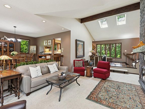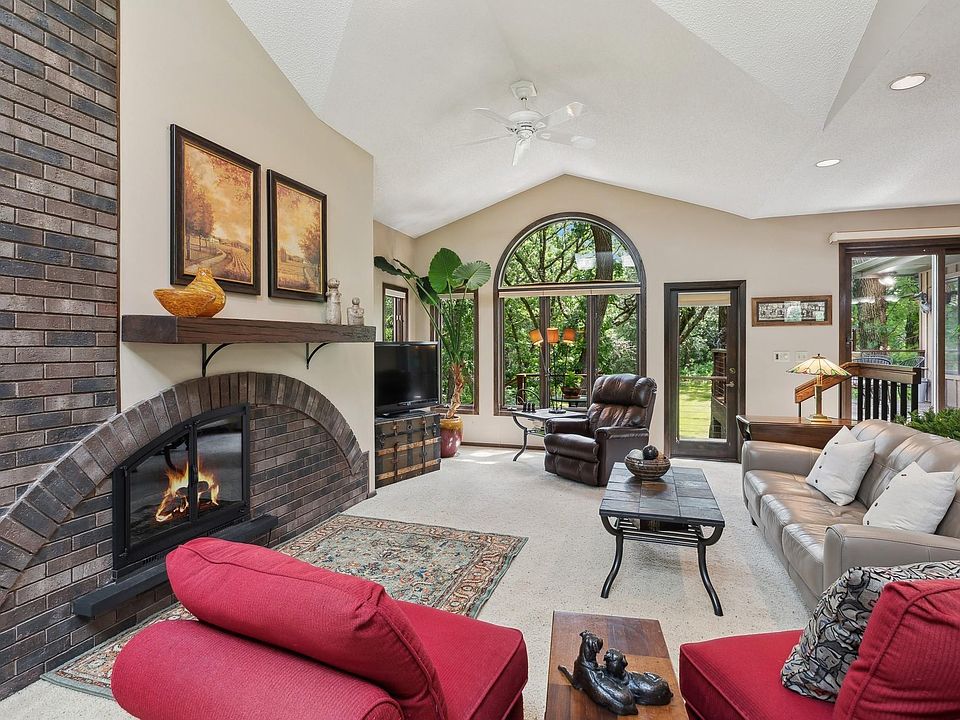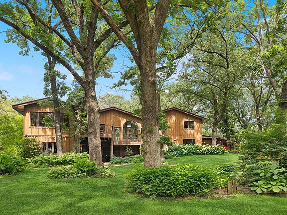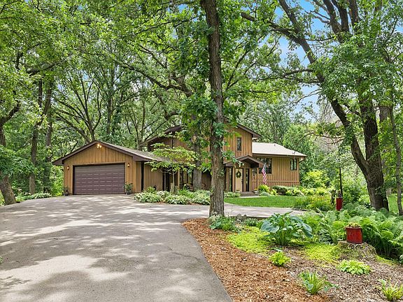 Privacy abounds! One-of-a-kind unique, stylish home on 3.16 acres wooded oasis! Let peace & tranquility fill your life. Casual, comfortable living spaces at every turn. Near Gateway Trail and Victoria Station! Mahtomedi schools! Soaring vaults, dramatic main level window views at every turn! Great room/ dining space built for entertaining! Two wood burning brick fplc! Eat-in kitchen offers richly stained cabinetry/stainless appl. Gorgeous tiled floors! Knotty pine four season porch-nature surrounds you! Five walkouts to fabulous, continuously tiered deck/cable railings. Primary bedroom suite private bath w/new walk-in shower & walk-in closet. Additional bedrooms share full bath! Generous sized walkout family room w/fireplace leads to deck & firepit patio. Fun! Half bath/laundry room also. Two sheds adjoin house plus walkout basement has more convenient storage. Surround yourself in the glory of grand oaks, garden beds, lawn & landscape. Roof 2023. Heated Gar. New Chimney insert. WOW!
