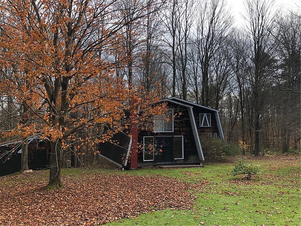 Great price and location on 5 treed acres! Very Unique contemporary home with over 2,000 Sq ft. 1980's addition family room with vaulted ceilings and two lofts. Deck off the back overlooking woods. Full basement walkout entry. Six mile creek runs through the property. Needs repairs/TLC however has great potential if your looking for a one of a kind floor plan home in a country setting. Home is being sold as-is.