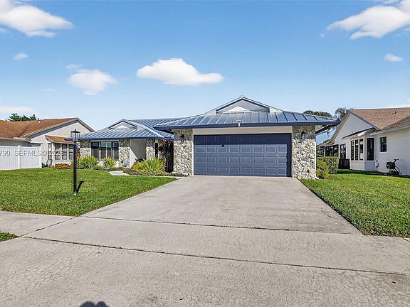 Lakefront home located in Boca Fontana has been meticulously updated, with 3-bedroom, 2-bathroom and 2 car garage situated on a 1/4-acre lot in the Estates section of Boca Fontana. This waterfront home has 2,174 sq. ft. with 14’ vaulted ceilings, crown moulding, and porcelain tile throughout the living room, dining room, entrance, and kitchen, with a brand-new roof in 2025, hurricane impact doors and windows, and a new 2-zone A/C system (2024). The open floor plan, with a chef’s kitchen, has a large pantry with wood cabinetry, with a stainless steel refrigerator, oven/stove and microwave, dishwasher, with dual sinks, and oversized counter space, with a beverage fridge that overlooks the family room, and dining room area with unobstructed views of the lake. The primary suite, has laminated wood flooring with his/hers walk-in closets and a renovated primary bathroom with a Jacuzzi tub and frameless glass shower. The additional bedrooms also have laminated wood floors throughout. Perfectly positioned in West Boca Raton between Glades Road and Yamato Road, this home is just minutes from the upscale dining and shopping, and A-rated schools with easy access to the Florida Turnpike and I-95.