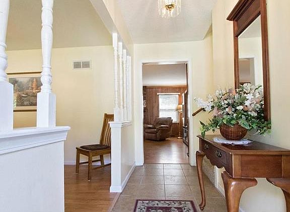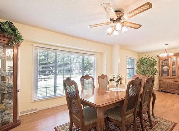 Spacious home features living room/dining room, remodeled kitchen with custom cabinets, family room with fireplace. Laminate flooring throughout main level with tile in entry and kitchen. New tub in main bathroom with tile floors and two vanities. Great size bedrooms. Large 4th bedroom on upper level with built in cabinets. Basement is unfinished with 2nd fireplace. Garage has door to backyard. Vinyl siding and thermal windows. New front stairs and driveway. Gutters and roof are newer.