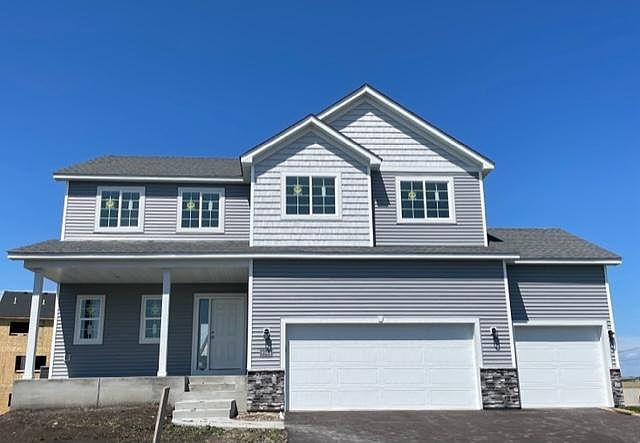 Two story home scheduled to be excavated in April offering an estimated completion in August. This well appointed two story home features an unfinished walkout lower level (can add a future family room, bedroom 5, and bath), spacious concrete front porch (8'x18'), Pella windows, stone accents, sod, irrigation system, and front yard landscaping nestled in a culdesac location. Main level highlights include an inviting foyer, half bath, great room fireplace mantle with mantle surround & stone accents, decorative stair rails, kitchen walk-in pantry & center island, kitchen window, mudroom with large walk-in closet, & LVP flooring. Upper level features a private primary suite with deluxe bath including a 4' tile shower & separate soaking tub with double sink vanity, 3 additional bedrooms, loft, laundry room with window, & another full bath. Photos and/or renderings may not depict actual home plan, features, materials, and finishes may vary. All measurements are approximate.