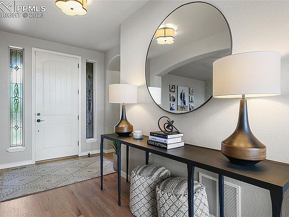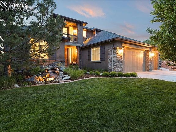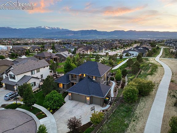 Luxury, location and lifestyle. Looks like a model home inside and out. Quality of craftsmanship is evident in the recently remodeled dream kitchen, laundry area, and primary bath. The cul-de-sac lot positions this home for remarkable views of Pikes Peak and the Front Range. The lush green space behind the home offers privacy yet easy access to the trail system connecting to the new park, Chinook Elem & Middle schools, and Cordera Comm Ctr. The lot is over a third of an acre, w a fenced yard, wooden play-set, hot tub pad, and prof. landscaping. The entrance greets you w soaring ceilings and a flood of natural light from the wall of windows which frame the mtns effortlessly. The great room, complete w a gas fireplace, flows nicely into the elegant kitchen where no detail was overlooked. This carefully planned space features JennAir double ovens, induction stove, built-in microwave, soft-close cabinets, and a Miele in-wall coffee system plus more. The primary suite is a romantic getaway w its own gas fireplace and beautiful tile surround. The en-suite is tastefully sophisticated and the custom walk-in closet is a show stopper. Take your time as you tour the glamorous bathroom that belongs in a five-star hotel. The main floor features another large bedroom + ensuite, formal dining, and walk-out. Upstairs features an amazing loft, balcony, two bedrooms + private full baths. Don't miss the custom laundry, complete w a built-in charging station to hide all of your devices. Downstairs there are two additional bedrooms, full bath, and office area. This is the perfect place to relax and entertain w family and friends. The media area features rope lighting and built in surround sound. The storage area is large and houses two water heaters, a second laundry hookup, furnace w an Aprilaire home humidifier, and the NVR home monitoring security center. Finally, you will appreciate garage cleanup made easy w the epoxy floors and when it is cold the Reznor unit will bring the heat.