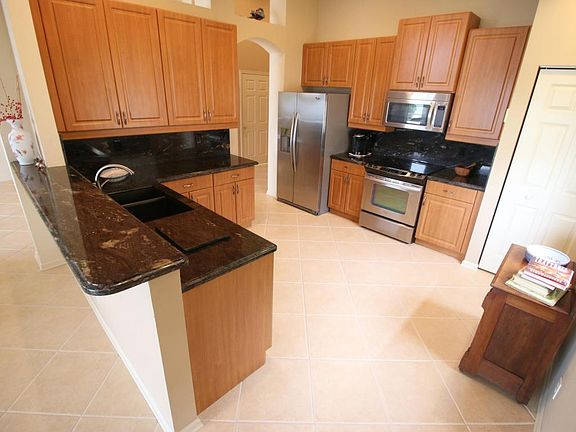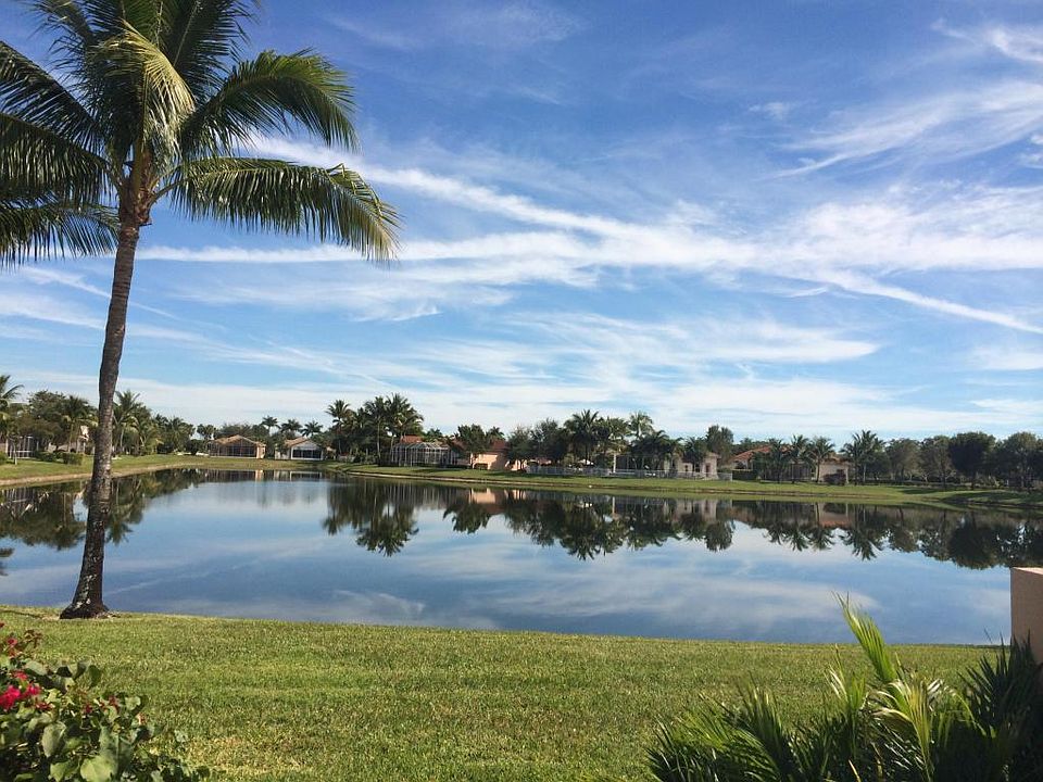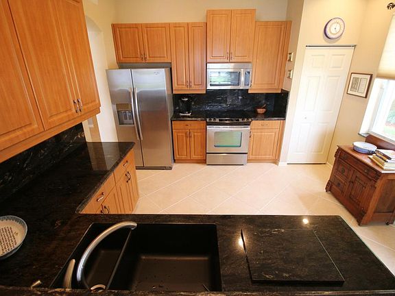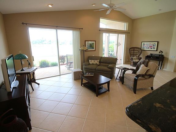 Superb panoramic lake views with delightful breezes. You will never tire of the ever changing beauty and wonders of nature in your own backyard. Interior decor features neutral tones with 18'' textured tile at diagonal in all living areas. There is no interior wall which creates an open and airy Great Room effect. Kitchen features dark granite with full back splash and newer stainless steel appliances. Master Bath has spa tub with separate shower. Third bedroom is utilized as a den and features double door entry and full wall built in display shelving. New 4 ton Carrier high efficiency a/c installed in June 2015. All windows protected by accordion hurricane shutters. Desirable pie shape lot. Patio is finished with brick pavers. Practical birdcage covered front screen entry. Easy to show.
