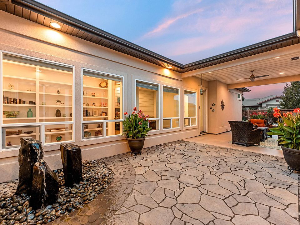 OPEN HOUSE SAT. OCT 4TH FROM NOON TO 3:00 PM. Gorgeous custom-built home on a quiet cul-de-sac. Thoughtfully designed horseshoe layout features walls of windows surrounding the beautifully paved courtyard, filling the home with natural light and creating an open, oasis-like feel. Just steps outside, enjoy the year-round outdoor experience w/2 separate covered seating areas, lg gas fire pit, garden space, and the tranquility of 2 water features. Home features top-of-the-line upgrades throughout w/spacious bedrooms; one room plumbed for wet bar. Mstr bath w/dual vanity, soaker tub, and two-door walk-through shower. Lg walk-in butler’s pantry, central vac w/equipment, fireplace, and built-in shelving, water softner. Finished 2-car garage w/epoxy floors, attached shop w/upgraded electrical, utility sink, cabs/shelving. Leave your car at home—minutes to shopping, dining, and more. Short path to 82-acre Freedom Park w/pond, pools, pickleball, tennis courts, and clubhouse. HOA incl. internet, irrigation, mowing, snow removal, sprinkler startup/blowout.