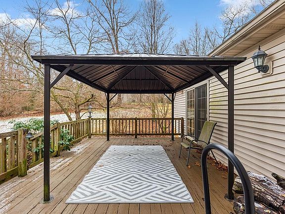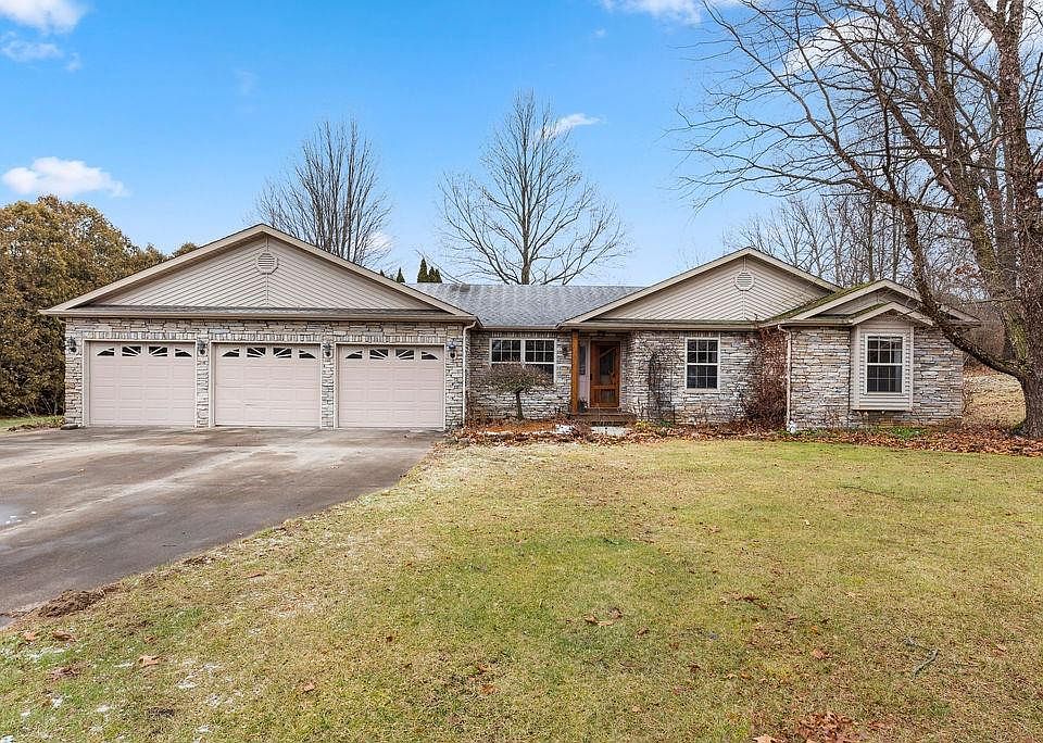 Enjoy country life in this cozy ranch home sitting on 1.45 acres with its own pond. As you step inside you will be greeted with an inviting open concept floor plan connecting the spacious living areas. The kitchen space, with new quartz countertops and large, 8 ft. island flows into the living and dining areas, creating a perfect space for entertaining. The fireplace in the airy and expansive rec room uses both gas and wood. It is an inviting place to enjoy those cold, snowy evenings. The large windows open up to a large deck and secluded back yard. The home continues with 3 spacious bedrooms and bath with whirlpool, soaking tub. For those that love working in the garage, it is both spacious and comfortable with both A/C and heat. There is an inground sprinkler system for ease in maintaining the lawn and extensive gardens. Schedule your appointment today to experience the peaceful allure of this exceptional property. SELLER TO PROVIDE HOME WARRANTY.