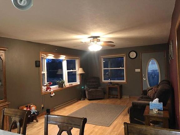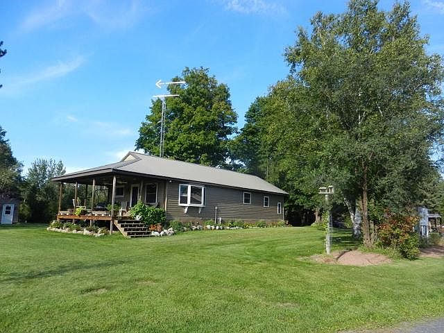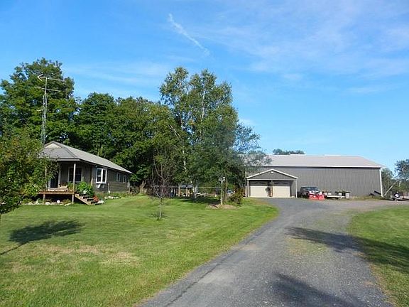 Charming 2-bedroom 2 bath home, incredible sauna building and an absolute dynamite garage and workshop that's to die for! Inside this 48'x72' beast you'll find in-floor heating fueled with either LP or the outdoor wood furnace, plus there is a forced air furnace, fully insulated interior lined with steel, 4 overhead doors including one 14' tall and the other 10' tall. Staircase leading to upper level storage, ceiling fans, airline hose piped throughout to 5 different areas, hot and cold-water basin sink, plus plumbed for a full bath! A decorative concrete patio leads to the home featuring an open concept spacious kitchen with built in dining, hard wood flooring, all newer windows, walk in tile shower, second full bath, 2 bdrms, awesome covered porch and full basement. All this on almost 8 acres, zoned commercial, access to the snowmobile and ATV trails and so much more!