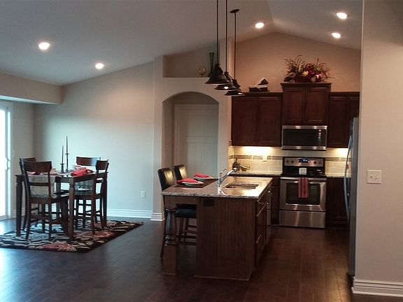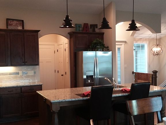 This home features a very open living design with vaulted ceilings and wood floor. The kitchen features a large granite eating island with all appliances and pantry. A separate laundry is located off of kitchen. Abundant arches and plant shelves add that custom touch. The split 3 bedroom design features a secluded master suite with a large walk-in closet. The master bath includes 2 Onyx sinks and a 5ft tiled shower. The basement family room is designed with entertainment in mind and includes a natural gas stone fireplace, wet bar, a kids play area located under the stairs, a 4th bedroom and full size bath. A 5th bedroom is framed and there is also another large storage room. This home features a 3 car garage, large yard, natural stone and brick. Landscaping will include a sod fescue front yard and seeded back yard with (2) trees. This property is agent owned.