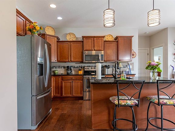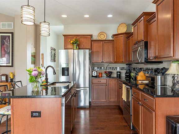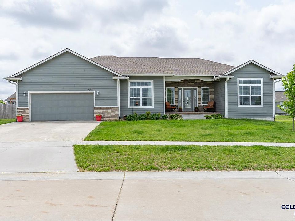 5 years young & located in the thriving Whispering Meadows subdivision, this 5-bedroom (6th NC bedroom/office), 3-bathroom ranch style home boasts over 3,200 square feet. Step inside the oversized entry to experience the one-of-a-kind floor plan that features an open concept kitchen/living space with a vaulted ceiling and gas fireplace. Around the corner you will find a formal dining room with storage for your linens & entertaining pieces. The large Master En Suite features a walk-in closet & double-door entry to the bathroom that has a double-bowl vanity, separate bathtub & shower. Two guest rooms & a full bathroom complete the split-bedroom design. Lower level has a HUGE family room with wet bar, two guest rooms, full bathroom, 6th NC bedroom/office & storage room. HOA dues of $300/yr covers maintenance of the subdivision entry signage, newly constructed in-ground pool w/zero entry kiddie pool & new playground space. Lawn was recently reseeded and deck will be repainted!