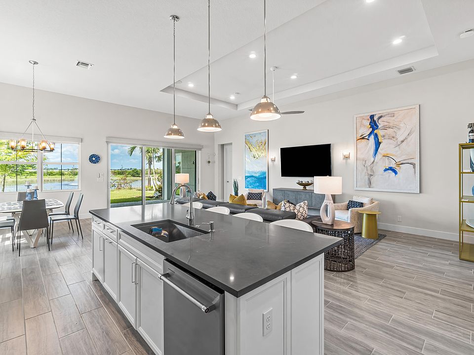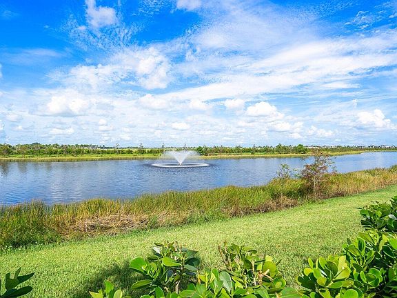 Move in ready, lake view home on premium lot with upgraded landscaping in Regency at Avenir in Palm Beach Gardens, a premier active adult (55+) community that offers the finest resort / club amenities without the hefty membership costs of a country club. The stunning clubhouse, The Pearl, has a full-time on-site activities director and a variety of inspiring clubs, activities, and events. The Pearl's luxurious amenities include a resort-style pool, spa, tennis and pickle ball courts, fitness center, wine storage, card & game rooms, golf simulator, and much, much more. A short walk to the clubhouse and mailboxes, this custom-built home completed in June 2022 offers the sought-after Maya model with 2,339 sq ft featuring 3 bedrooms & 2.5 baths. A 4th room with a custom built-in office, and over $200K in upgrades. Its inviting covered entry flows into the extended foyer with tray ceiling, opening onto the expansive great room with surround sound ceiling speakers, a bright dining room, and a spacious covered lanai. The well-equipped kitchen features upgraded stainless steel Kitchen Aid appliances and extras including a warming oven & beverage center and is highlighted by a large center island with seating for 4, plenty of counter and cabinet space, and ample pantry. The private primary bedroom suite is complete with a door to the lanai, a luxe tray ceiling, dual custom built walk-in closets, and a deluxe primary bath with dual-sink vanity, large soaking tub, glass-enclosed dual rain shower, linen storage, and a private water closet. Additional bedrooms feature sizable closets and a shared full hall bath with linen storage. The covered lanai is wired for internet, stereo and TV and features a motorized retractable screen. It opens onto a spacious western exposure, lakefront, fountain view landscaped backyard with room for a pool and perfect for enjoying gorgeous sunsets. The home is equipped with a whole home generator, whole home security system, retractable shades, window treatments, ceiling fans, and epoxied garage floor. This home truly has it all; you can move in right away and not have to wait for your home to be built or completed.