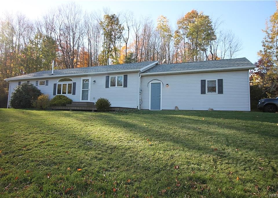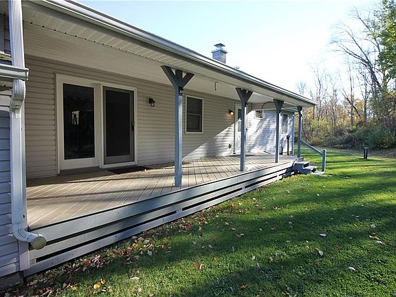 Welcome to Wesley Road! This well-maintained ranch home sits atop a knoll overlooking a tranquil pond. Enjoy the view from the front porch or prop up against a willow tree and take in the fresh, country air. The living room boasts a vaulted, tongue and groove ceiling with exposed beams. The eat-in kitchen with dining area has sliding glass doors out to the covered back porch. You'll also find two bedrooms, a full bathroom with laundry area, and an owners suite with full bathroom and walk-in closet. The full partially finished basement offers a bonus room and room to finish to your taste.