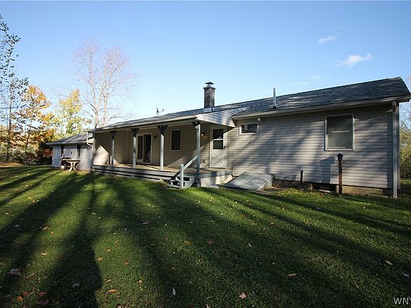 Welcome to Wesley Road! This well-maintained ranch home sits atop a knoll overlooking a tranquil pond. Enjoy the view from the front porch or prop up against a willow tree and take in the fresh, country air. The living room boasts a vaulted, tongue and groove ceiling with exposed beams. The eat-in kitchen with dining area has sliding glass doors out to the covered back porch. You'll also find two bedrooms, a full bathroom with laundry area, and an owners suite with full bathroom and walk-in closet. The full partially finished basement offers a bonus room and room to finish to your taste.