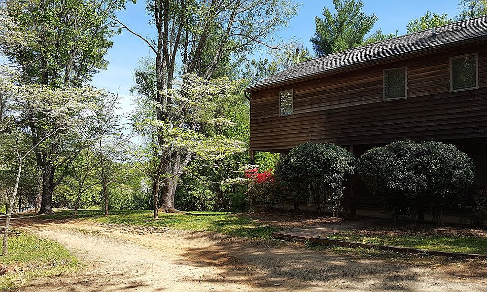 South facing passive solar French country design, three bedroom, three bath home features huge (11x40) combo family/dining/sun room with floor-to-ceiling windows, fully bricked floor, and floor to ceiling partially bricked walls behind both high heat producing wood stove in family room that provides a cozy atmosphere in winter, and standard fireplace in living room. Fans built into the wall at the top of the vaulted ceiling help move both heated and cooled air between the floors. All bedrooms, family and living room have ceiling fans with lights. Family room has two ceiling fans and two hanging light fixtures, and two high platforms with large wired-in stereo speakers that will stay with the house. Central vacuum system easily reaches both floors. Home has TWO linen closets and laundry facility on second floor for easy access to bedrooms. Master bedroom contains one of the linen closets and large walk-in closet. Kitchen has plenty of storage, 15 drawers (3 deep drawers), 11 double cabinets, and 4 single cabinets, pantry, features all Kitchenaid appliances. Living room has built in cabinet, an opening overlooking family room, and two built in bookcases, and coat closet has additional large storage area in back under stairs. Sliding glass doors in living room and kitchen open to front of house, slider in family room leads out to large deck in rear of house for al fresco dining or entertaining. Property has detached two car garage with automatic garage door opener. Free standing cottage with front porch screening can be a private guest room, in-law apartment or rented out for 30+ days or used as an office as it is wired for internet and cable TV. Cottage has full bath and two closets, kitchenette with sink, cook top and small refrigerator. House interior completely repainted January 2015, house floors refinished February 2015, sunroom roof replaced 2003, main house roof 2011, cottage and garage roofs replaced November 2014, cottage interior has all new drywall and insulation, painting January 2015. New air conditioning unit installed April 2016. New gravel driveway April 2016.