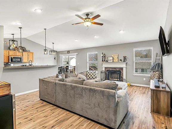 This beautiful 3-bedroom 2 bath aspen ranch is move in ready with many upgrades. Upgraded width of driveway with two feet on each side. Outside lighting and spotlight, extended garage space for storage, 60 AMP outlet for electric car available. When you first walk in you won't be able to miss the vaulted ceilings, laminate flooring throughout and the modern light fixtures. Wood burning fireplace in the living room for those cozy winter nights and LED DIM recessed lighting in there. When you first walk into the kitchen the Granite counter tops and breakfast bar will grab your eyes but make sure to see the updated stainless steel appliances and updated kitchen sink and faucet. First floor laundry and master suite with a walk in closet. Make sure to take a walk out back to see the 6x40 stamped patio with hot tub perfect for entertaining or just enjoying a nice dinner outside. This home is ideal for making memories. Don't wait to book your showings!