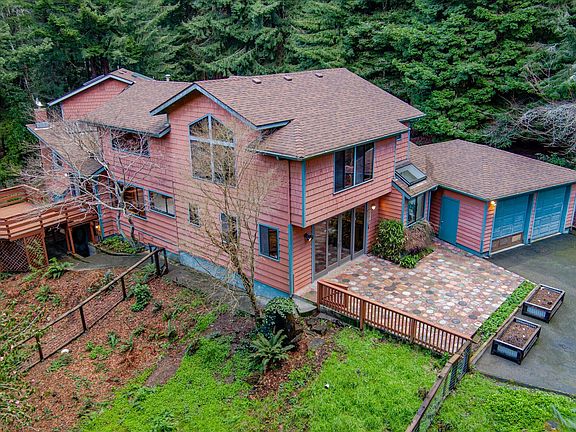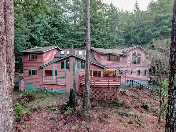 Designed by local Architect Dorsey Longmire and located at the top of California Ave on one of the most ideal lots in Arcata. This one acre parcel shares a property line w/ the 2,350 acre Arcata Community Forest. Hop onto your own private direct access to endless walking, mtn biking and horseback riding trails from your backyard. Home was constructed to entertain with exotic woods, stone finishes, and incredible forest views throughout. Two of the four bedrooms have their own ensuite baths. Wrap around driveway w/extra large drive through garage and plenty of storage. Large sunken living room has cathedral-like vaults with skylights and 2-story rock fireplace.The kitchen incl. custom Italian light fixtures, and granite countertops that opens to a comfortable livingroom w/its own fireplace