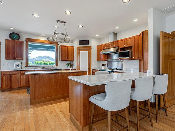 Sited on 1.91 acres, this gorgeous 4 Bedroom/3 Bathroom home boasts a seamless blend of style and functionality. Features include hardwood floors, numerous built-ins, gas fireplace, large windows and stylish wood trim. The gourmet kitchen, adorned with Italian marble countertops, gas range, and beautiful cabinetry is an entertainer's dream, effortlessly connecting the living and dining rooms to the covered outdoor patio. Along with the great room, located on the main floor are both a spacious primary suite, as well as a guest bedroom, second full bathroom, laundry room and mudroom. Upstairs you'll find two additional bedrooms (one currently set up with a built-in desk and shelves), a full bathroom and a generously sized bonus room, complete with wet bar, that offers endless possibilities. For added convenience, an oversized 3-car garage, RV parking with hookup, a large outbuilding, and a shed transformed into a stylish office enhance the property's appeal. Professionally landscaped outdoor spaces, along with views of Mt. Hood and Mt. Adams from the upstairs and from around the property, create the perfect backdrop for relaxation and entertainment. Situated close to schools, shopping, the Westside and Indian Creek Trails, this home offers the perfect balance between peaceful privacy and the convenience of Hood River's many amenities. This is a rare opportunity to find a property of this caliber on Hood River's coveted west side. Come check it out! Easy to show; call your agent to set up a personal tour. More info: https://listing.ridgetopmediagroup.com/995-Hutson-Rd/idx