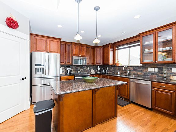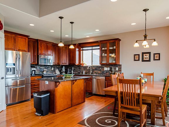 Quality built neat & clean raised ranch with great curb appeal. 5BR/3BA - main floor laundry plus room for office. Finished with Hardwood floors, granite counters, master bath W/ceramic tile shower & floor. Lower level has 9 ft ceilings huge family room with wet bar and room for pool table and gaming area plus 2 large bedrooms. The heated garage is finished and has second story storage. Large deck off of master bedroom and dining leading to private fenced yard with sprinklers and separate play area. The back yard is over 12000 sq.ft and borders wide open spaces for additional privacy