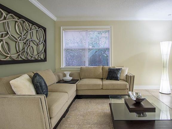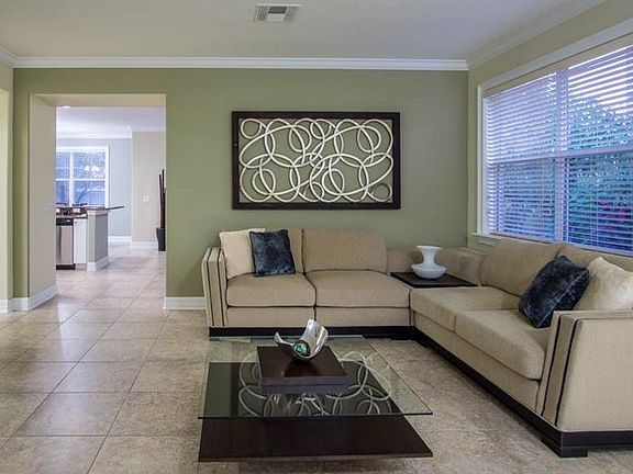 Modern, sleek and clean lines but at the same time warm, inviting and a tropical escape are all the emotions that are swirling around and you feel this home has a positive energy all it's own. Beautiful 20" tile throughout the property with the exception of the bedrooms which have smooth eye popping laminate floors including the closets. Crown molding throughout the whole property and baseboards throughout all the windows have had custom casing. Simple yet fantastic upgrades to this home at a price where it makes sense to reward yourself by making this home your own. Guest bath with two entrance and frame-less walk in shower tiled throughout. Calling all you snowbirds who want luxury at an affordable price and those looking for fantastic schools and an area that is growing faster than anywhere in Central Florida. All the privileges of Lake Nona, close to highways, the best in shopping, medical,45 minutes to beaches and a community that boasts world class golfing, a luxury community center and restaurant, security manned gate and a feeling of peace. Stroll through a community where your neighbors actually call you by name and you feel like you belong. Come take a look for yourself and see that pictures don't lie. This house does look more amazing in person than the pictures can show. All appliances included. The RING doorbell does not convey. A normal doorbell will be installed prior to closing.