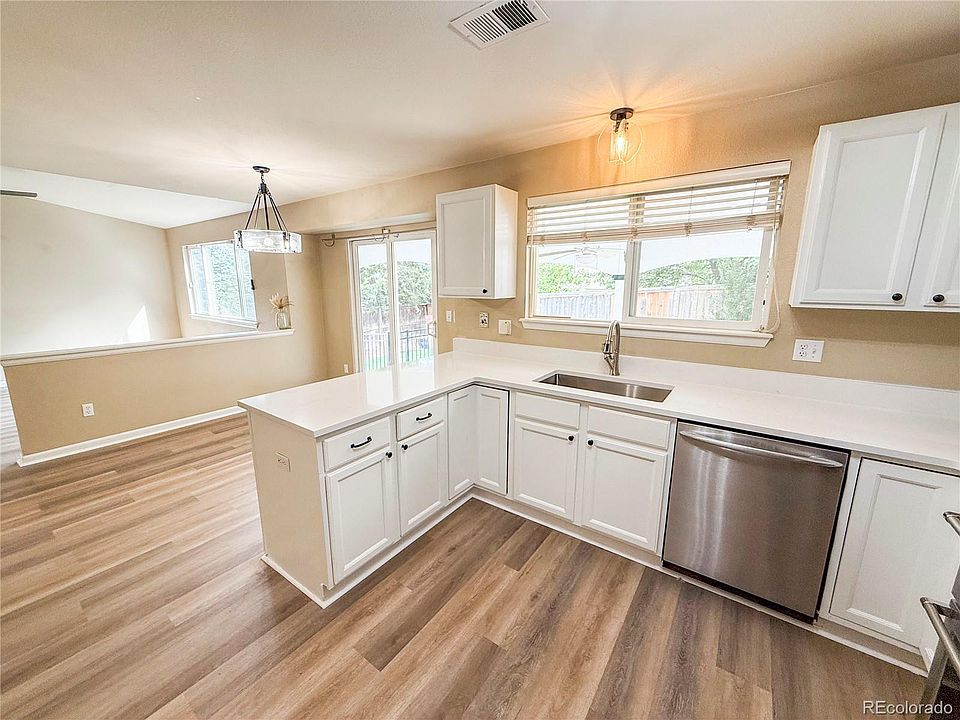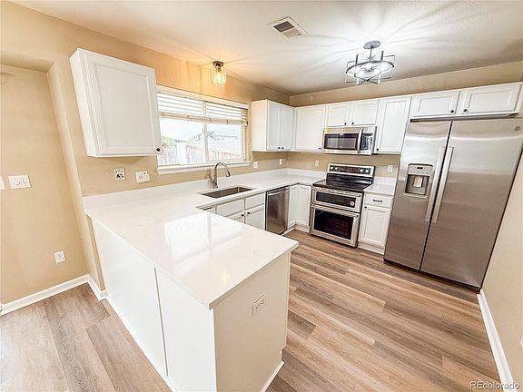 New quartz and granite in bathrooms and kitchen. Recently added vinyl plank flooring throughout main floor, new carpet installed upstairs and down stairs. New light fixtures throughout the home. Welcome to 9950 Sydney Lane, a two-story home nestled in the desirable Eastridge neighborhood of Highlands Ranch, Colorado. Built in 1996, this 2,077 sq ft residence offers 4 bedrooms and 3 1/4 bathrooms, providing ample space for comfortable living.