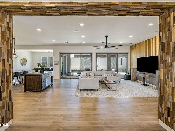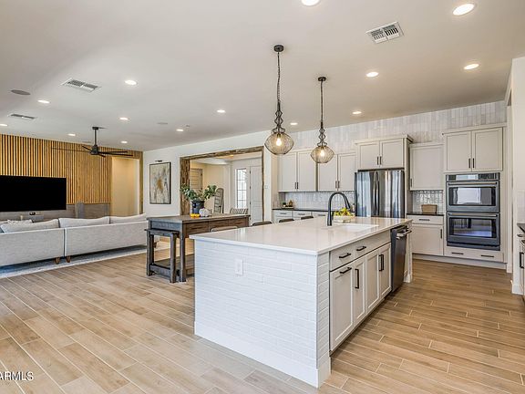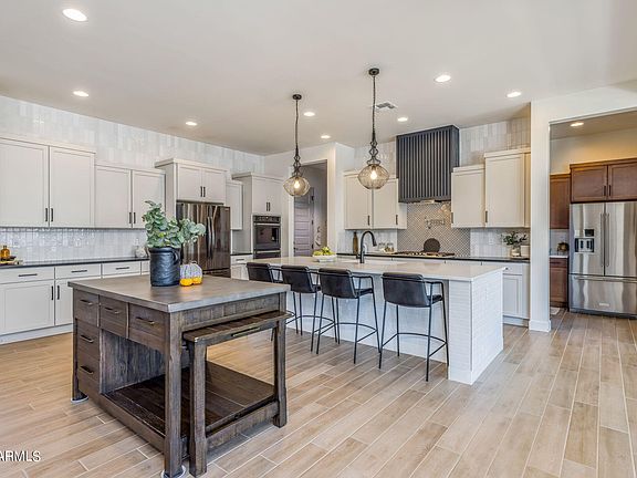 Wow! Where do we even begin with this beauty! This jaw dropping, move-in ready 5 bedroom 5 1/2 bathroom home is nestled in the highly sought-after Eastmark community! The beautiful paved driveway, 5 car deluxe garage, double door entry, and the beautiful courtyard truly enhance this home's stunning curb appeal. Walking into the home you will be greeted by 4222 sqft of impressive living space. Throughout you will notice stylish, modern accent walls, wood look tile flooring, and custom finishes throughout. Making your way into the gourmet kitchen you will be blown away by the staggered two toned kitchen cabinets, the morning kitchen, tile that goes from the counter tops all the way up to the ceiling, a large walk in pantry, and the double ovens.(CLICK TO READ MORE) The bedrooms in this home all have upgraded berber carpet, a private bathroom, and a walk-in closet. The owners ensuite features an all tiled super shower, stunning natural light, and separate vanities. Step into your backyard and you will have your own private oasis! The gorgeous pool is heated and completely surrounded by travertine. This backyard is the perfect space for entertaining guests. Just like a world class resort this community offers a luxurious community pool, splash pads, numerous parks spread throughout, the Steadfast farm, the Handlebar Diner, and its very own state-of-the-art clubhouse "The Mark". The Mark hosts events throughout the year and a wide variety of family friendly games to play. If this home checks off all of your must haves, then come make an offer today before it's too late!