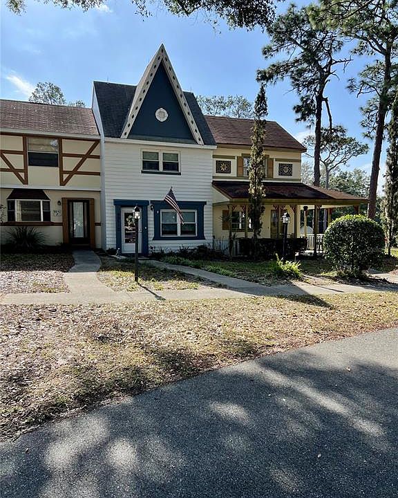 Welcome to this beautifully refreshed 2-bedroom, 2.5-bath townhouse located in the charming Americana Village, known for its vintage European-inspired setting. Thoughtful cosmetic updates throughout provide a fresh, updated look while preserving the character that makes this community so admired. The inviting floor plan features a cozy living area with a fireplace, creating a warm connection between the family room and kitchen, ideal for everyday living or relaxing evenings at home. Each bedroom offers its own private bath, with an additional half bath conveniently located on the main level. Enjoy a peaceful lifestyle surrounded by manicured grounds, including a gazebo nestled within a park-like setting—perfect for enjoying Florida’s beautiful weather. This townhome offers easy access by golf cart to nearby shopping, dining, and community conveniences. Residents also enjoy access to a wide range of amenities designed to support an active, engaging lifestyle. A wonderful opportunity to own a low-maintenance home in a quiet, well-established community with timeless appeal.