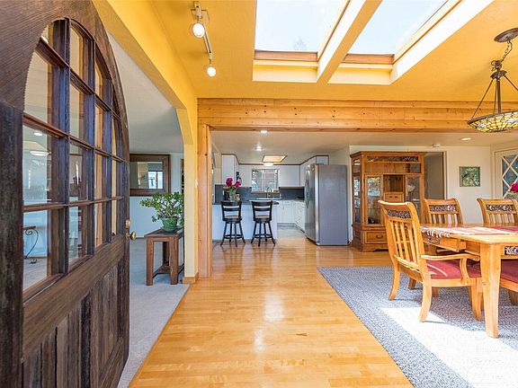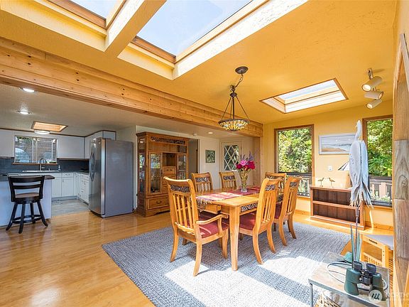 Enjoy waterfront living with this charming 2-bedroom, 2-bath home offering 1,241 sq. ft. of comfort and style. Set on 63 feet of low-bank waterfront, this home boasts sweeping views of the Sound, West Seattle, Blake Island, ferry crossings, and marine traffic. Inside, discover a beautifully remodeled kitchen with white cabinetry, stainless appliances, and a skylight, plus a cozy peninsula with eating bar. Birch hardwood floors, newer carpet, and a gas fireplace add warmth and character. Each bedroom has its own full bath, and the spacious living and dining rooms are filled with natural light and water views. New roof, skylight, and hot water heater. Tideland rights and beach ownership to the low tide line. Possible Airbnb potential!