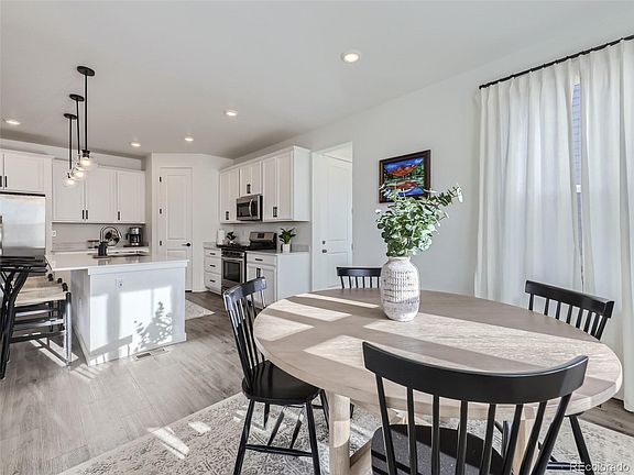 STILL UNDER 1 YEAR BUILDER WARRANTY. This stunning home is practically brand new!! Immaculately designed with contemporary flair and flooded with natural light, this home offers a sanctuary of comfort and style. From the moment you enter, you'll be greeted by an open floor plan & expansive living areas that seamlessly blend functionality with sophistication, ideal for gatherings with loved ones or quiet evenings spent in blissful solitude. The kitchen's spacious layout offers the perfect canvas for culinary creativity, while updated fixtures & lighting add a touch of elegance to every mealtime experience. The large island, sleek granite countertops, & stainless steel appliances make cooking a joy. At the same time, the adjacent dining area offers a perfect backdrop for memorable gatherings. Boasting 4 bedrooms & 3 bathrooms, this home provides ample space for both relaxation & entertainment. As you explore further, you'll discover the luxurious primary suite, a haven of tranquility featuring a spacious bedroom, huge walk-in closet, & a primary bathroom adorned with updated fixtures and lighting, a large vanity with dual sinks including a convenient sit-down vanity area – the prime spot for your daily self-care routine. Outside, a large covered back patio beckons, offering the ideal place for al fresco dining or simply soaking in the serene surroundings. With a 3-car garage & situated on a corner lot, convenience & curb appeal blend seamlessly. The allure of this home extends beyond into the vibrant community. Residents enjoy access to an array of amenities as part of the HOA, including parks, trails, pools, a fitness center, a clubhouse, & even a local coffee shop, ensuring every day is filled with adventure. Home is located 25 minutes to Downtown Denver, 15 minutes to DIA, and 20 minutes to Buckley SFB. With the added peace of mind of being under the Builder Warranty, there's never been a better time to make this house your home. Schedule a showing today!