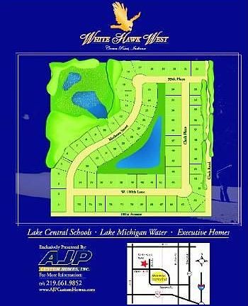 Listing agent: Jim Moore, Call 219-662-9533 for information. WHITE HAWK WEST...Home of the 2007 Parade of homes. Executive homes with Lake Michigan Water ... Lake Central Schools. Community is only 75 homes, without possibility of future phases. Take advantage of this amazing opportunity to be in a small, quiet, comfortable community that has quickly become one of the most exclusive subdivisions in Northwest Indiana! Golf Course View Lot!! *Many Homesites have Private Backyards* ~Day-Light and Walk-Out Lots Available~