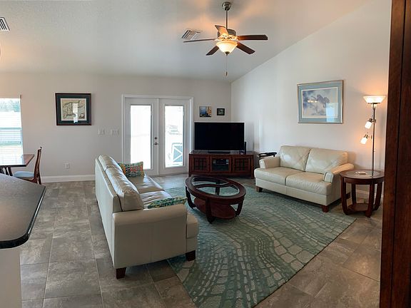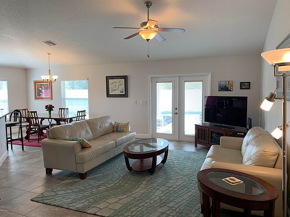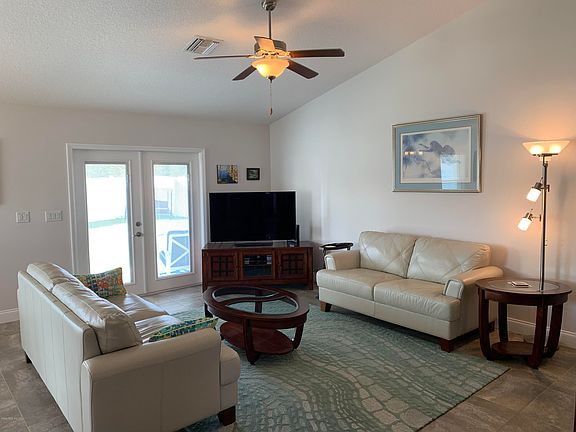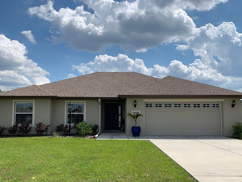 Like new home in popular SW Ocala family community. 2017 year built, gently lived in 3 bedroom, 2 bathroom CBS home with an over-sized 2-car garage with upgraded garage door with window panel for natural light. Split BR plan, tile floors throughout except BRs, vaulted ceiling, open concept, upgraded all-wood cabinetry with soft-close drawers and doors in kitchen and baths, granite tops in kitchen and baths. Stainless steel appliances in ktichen. Owner's suite features vaulted ceiling, large walk-in closet, glassed-in shower, dual sink vanity; great room features double French doors w/built-in blinds looking out to 8'x15' covered patio and privacy fenced spacious backyard with lots of room. No neighbors to the rear offer a private backyard.