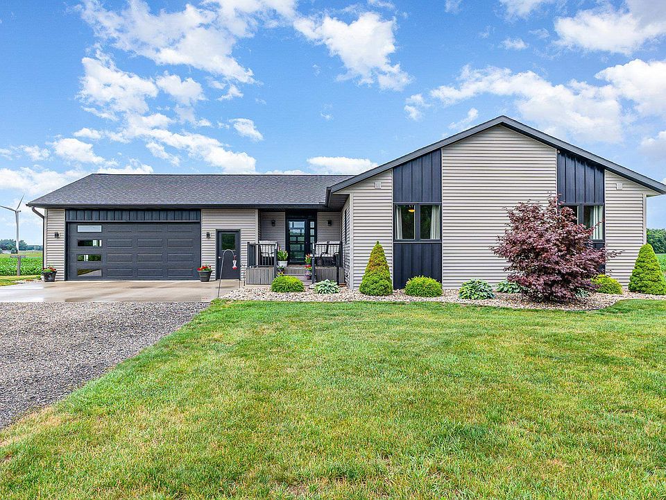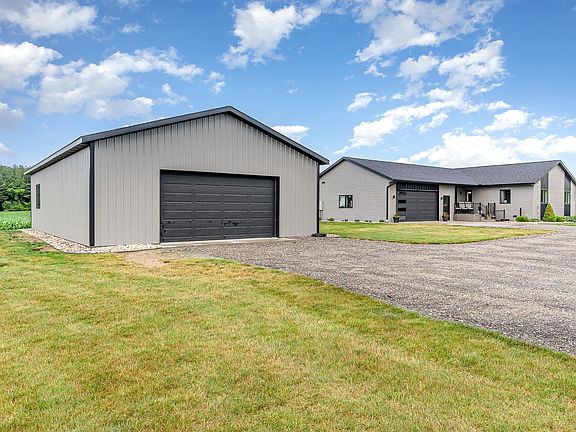 This absolutely gorgeous 4-bedroom, 2.5-bathroom home has high-end finishes throughout, including a 50-year shingle and Andersen windows. It was custom-built in 2019 by the meticulous builder, Jim Steere! The home sits on 1.5 acres with expansive country views to the West. There are nearly 3000 square feet of finished living space between the main level and the mostly finished walkout basement. The main level features an open concept floor plan with vinyl plank flooring, laundry room, a massive kitchen island with Quartz countertops, and a jack and jill primary suite set up, with a four-piece bathroom. The basement has ample storage areas, a family room, and two bedrooms with walk-in closets (egress windows) plus a full bathroom. The oversized and attached 2.5-car garage is finished. Wait until you see the 30 x 48 pole barn, half of it is finished and heated with 110-and 220-amp service. Other wonderful features worth mentioning are the whole-house Generac generator, the two owned propane tanks (one for the house and one for the workshop), oversized downspouts for drainage, and a composite porch and deck. So, whether you are sitting on the covered front porch watching the sunrise or on the elevated back deck watching the sunset and wildlife, this country setting will provide a sense of peace and calm for many years. Seller to provide the buyer with a one-year home warranty!