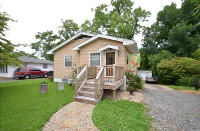 What a unique bungalow situated on a very private setting. Entering through the back door you will find a nice covered sun porch that opens to the kitchen and family room in the basement. There is an eat in kitchen and plenty of cabinet space! The laundry is also on this floor along with a 3/4 bath (shower is not operable at this time). There is also an extra room for storage, a small utility room where the water heater is located and an additional room that has made the perfect kids playroom. The main floor has a lovely foyer entry with tile flooring and craftsman style doors, a family room, a bonus room that opens to one of the 3 bedrooms. There is also a full bath. Outside there is a detached one car garage for storage and a deck that overlooks a private wooded lot! Minutes to shopping and I64!