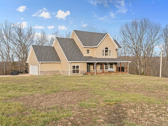 Custom built home situated on 10.17 usable acres offering space, privacy, and flexibility. Nearly 4,000 square feet of living space with an open concept living, dining, and kitchen area featuring soaring ceilings, custom cabinetry, concrete countertops, and a gas range. Main level primary suite includes scenic views, walk in shower, jetted tub, and walk in closet. Main floor also offers a home office, mudroom, laundry room, and guest bath. Upper level features two spacious bedrooms, a full bath, and a balcony overlooking the great room. Third level bonus room with bath provides additional flexible living space.Fully equipped walk out basement currently operating as a successful Airbnb with two bedrooms, full bath, kitchen, and separate laundry. Property includes garden area, chicken coop, open acreage currently used for hay production, and wooded areas for privacy. Outdoor features include a poured concrete patio, fire pit area, and large front porch with swing. Located at the end of a private drive, offering peaceful seclusion while remaining close to local amenities. Optional purchase available for the home on approximately 5 acres for $525,000.