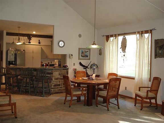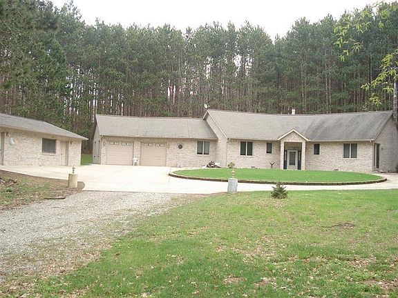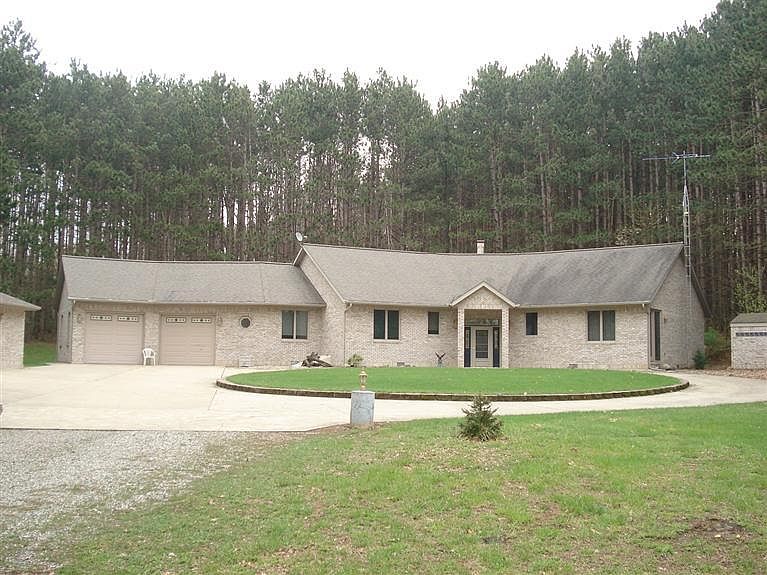 Secluded Brick Ranch, 13 wooded acres surround this private custom built home. Vaulted ceiling and open floor plan accentuate the beauty of the floor to ceiling stone two-way fireplace. Living area open to kitchen, featuring a snack bar, newer appliances, jenn-air range. Master bedroom suite with sauna right outside your patio door! Huge living area with large windows and three section patio door to enjoy nature. Stereo system throughout home. Three bedroom, three bath, den, main floor laundry and office. Two car attached garage plus heated 24x40 brick front garage/workshop. Also 22x40 pole building for toys or animals. This company makes no warranty or representations about te contents of this data.Taxes could change for the buyer after a closed transaction.