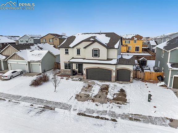 Luxury Home Spanning Nearly 5,000 Square Feet! QUICK CLOSING! This stunning two-story residence, built with quality by Reunion Homes, contains a tremendous amount of upgrades, 7 spacious bedrooms (most w/walk-in closets), & an enormous recreation area in the finished basement! Larger doors for mobility concerns/wheelchair. After entering the foyer, an 18 foot ceiling, you will notice a front office with French doors for a dedicated workspace. Open floor plan is perfect for entertaining, allowing a smooth flow between spaces while baking or preparing meals in the gourmet kitchen, which is equipped with new stainless steel appliances. You'll love the elegant espresso cabinets & the expansive granite countertops along with the island. Don't forget to check out the spacious pantry. Large family room is light & bright due to the expansive windows. The custom chandelier adds an extra dimension of charm. All bathrooms fitted with granite countertops & taller cabinets. Enjoy a true retreat as you enter the primary bedroom with large windows w/enough space for a sitting room. The ensuite bathroom boasts upgraded finishes, including a spa-like shower, a linen closet, & a substantial walk-in closet. Basement includes an additional bedroom with a walk-in closet, along with two recreation rooms, one measuring 30 x 17 feet; perfect for entertaining, a children's sport area, pool table, or whatever your heart desires. The mechanical room = additional storage space to keep your decorations hidden until needed. You will appreciate the extra-deep three-car garage, which could function as a workshop or storage space. All Levels have 9 ft ceilings. New High Impact Level 4 roof with transferable warranty & oversized gutters, water heater new in 2022, New Dishwasher-StoveTop-Refrigerator in 2023, 9ft high ceilings on all levels. Minutes away from I25, Fort Carson, Powers Corridor, & shopping. Subdivision includes parks attaches to walking trails and walking distance for a K-8 School.