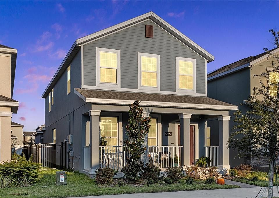 Think Green! WELCOME to an eco-friendly SOLAR community! This practically new single family home offers two stories, a detached two car garage in rear, fenced yard, and stunning curb appeal of luscious landscaping and covered front porch. Come on in to this welcoming foyer with your home office, den / flex room. As you continue enter a wide open kitchen with quartz counter tops and stainless steel appliances. Other outstanding features include a large family room plus a powder room all on stunning wood plank tile. All 3 bedrooms can be found upstairs with large master suite complete with walk-in closet and luxury master bath with quartz dual sink vanity, garden tub and shower, upstairs Laundry room, and second full bath. Outside you will find a spacious patio great for entertaining with a fenced yard and access to the two car garage. Don’t miss your opportunity to live in this amazing home in this amenity-rich community with resort style pool, fitness center, playground, splash pad, walking trails, dog park and MORE! Located minutes from the 417, Orlando International Airport and Lake Nona’s Medical Center as well as easy access to the 528 and I4
