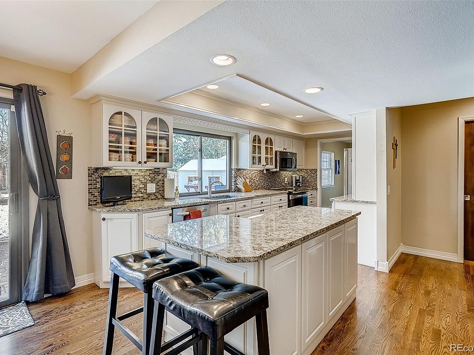 Welcome home to this immaculate and beautiful 4 bedroom, 4 bath home located in The Pond neighborhood in Arvada. Home is located in a cul-de-sac. The covered front porch with swing welcomes you home. Gleaming hardwood floors greet you upon entry. Open concept kitchen and family room. Home is perfect for entertaining. Main floor office is great for work from home or remote learning. The light and bright kitchen offers stainless appliances including double ovens, microwave, refrigerator, dishwasher. Plenty of preparation space with the granite counters and island. Casual dining opens to the spacious family room with vaulted ceiling, built in shelving and gas fireplace. Dining room is perfect for family gatherings. Large laundry room. Updated powder room. Master suite offers a walk in closet and nicely appointed bath with marble counter. Three very spacious bedrooms share a full bath with double sinks, granite counters, tub. Finished basement offers a great room, bar area perfect for watching the big game, beverage refrigerator, bath with shower and a flex space which could be another office or playroom and a storage room. Backyard offers an expansive brick patio for entertaining. Gardeners will delight in the garden space as the entire upper backyard has been vegetable and flower garden. Solid wood 6 panel doors. A/C and attic fan for comfort. Well maintained home. For buyers peace of mind in this competetive market, furnace has been cleaned and certified and sewer line has been cleaned and scoped for new owner. Sellers will provide one year home warranty if desired. The Pond is a very special community that offers a private 35 acre lake perfect for fishing, kayaking or paddle boarding as well as a sports court, tennis courts, children's garden, 2 playgrounds and a swimming pool. Location is convenient to both Denver and Boulder. Walk to Standley Lake Library or Standley Lake. A must see home!!